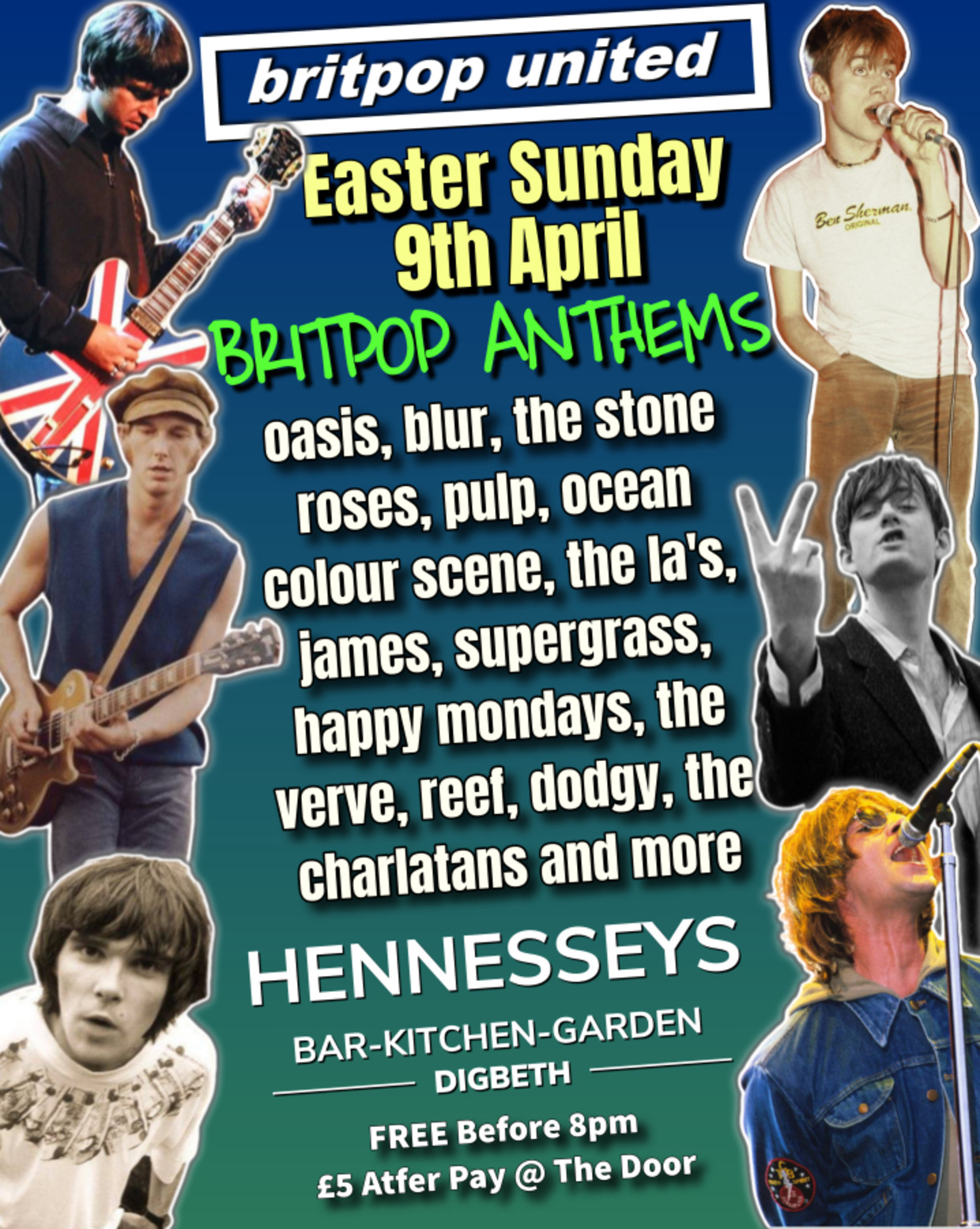 Come and enjoy some classics hits from the Best British Indie and Britpop HIts live at Hennesseys on Saturday 22rd Aprill. A great night atmosphere is guaranteed.